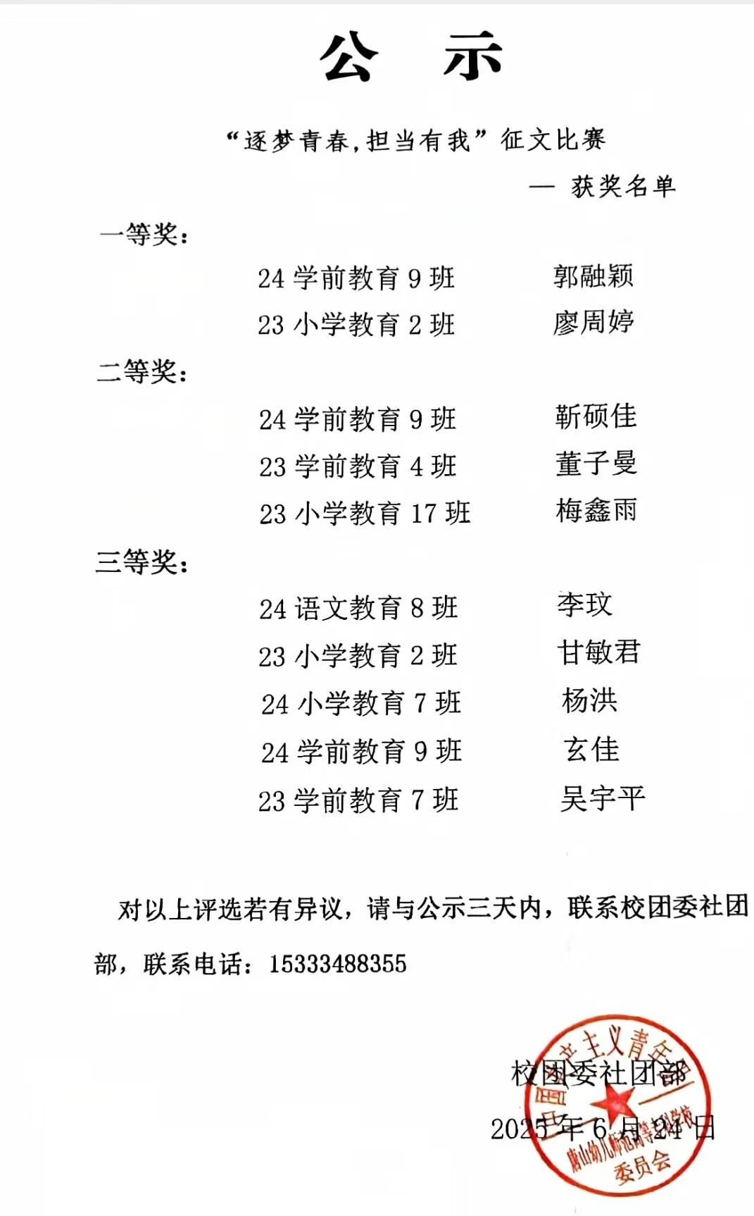 【公示】“逐梦青春,担当有我”征文比赛获奖名单