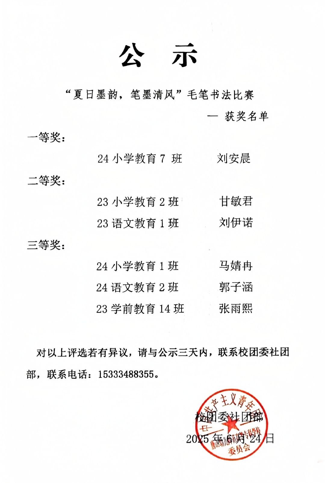 【公示】“夏日墨韵,笔墨清风”毛笔书法比赛获奖名单
