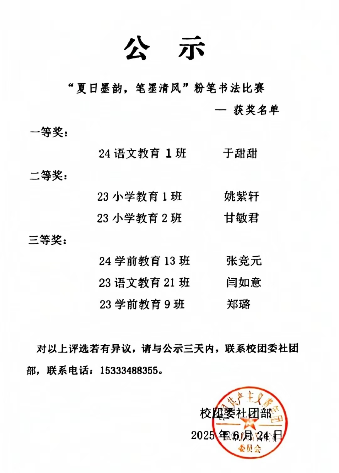 【公示】“夏日墨韵,笔墨清风”粉笔书法比赛获奖名单